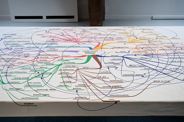 Under/Valued Energetic Economy (a term inspired by Alexis Pauline Gumbs) is an installation and work in progress which maps out the tangled ecology between “activism”, “arts” and “academia”. Presented on a trestle table top with objects and artifacts that references their interest in kitchen-table conversations and the knowledges that are produced by them, the work highlights informal strategies of organising, creativity and collectivity as valuable. It also explores alternative archiving of his/her/their stories. This work has been shared at Wysing Arts Centre ‘More of an Avalanche’ 2017, Jupiter Woods 2018, Mimosa House Gallery ‘Do you Keep Thinking there must be something more’ 2018, La Ferme Du Buisson ‘Take Care’ 2019, Precarious States 2021 and Project Space Dublin 2022.