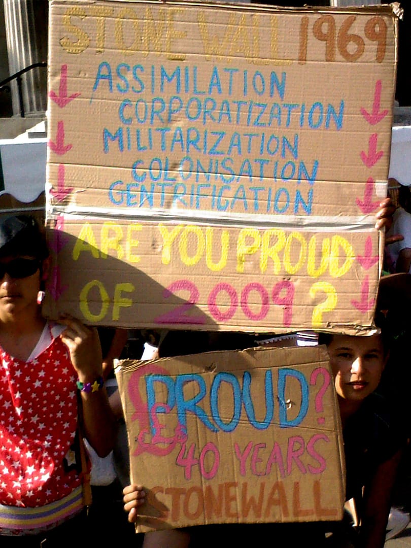 ‘We talked back, calmly and quietly, playing by their rules. We worked our asses off, while staying obediently in our ‘diversity’ and ‘awareness’ corners. The margins belonged to us, in part, because we were educated and light. We asked, politely and intelligently, to please not kick our issues off the agenda again. We waited for that moment of inclusion….We appealed to a false rhetoric of Community and Experience, and saw our labour converted into ever new money-making enterprises for white people, read our words translated into ever new p.c. acronyms, for policies made up to keep us down. We defended queer and trans identity with our nails and our teeth, until we realized it had been turned to capital for a select few hyper-privileged opportunists. And yet we were afraid of losing this community, because at this time and place, in2000s London UK, where gender violence rules the streets……we had nowhere else to go. Tired as we were of being tokenized, patted on the head, divided, and ruled, we put up and we shut up. We probably sold out somewhere on the way. It was the war on terror that signaled enough was enough. The unhesitating support that British feminist, LGBT, trans, even radical queer activists have lent to their leaders under the auspices of ‘liberation’, ‘sexual citizenship’ and ‘gender recognition’, the enthusiasm with which gender activists are enlisting themselves as imperial citizens…..has finally forced us to keep eyes wide open. And we are – scared. But, even more, angry and disgusted and, increasingly, disloyal.
