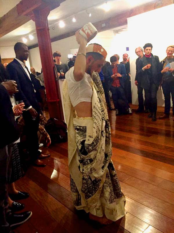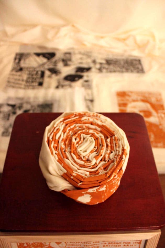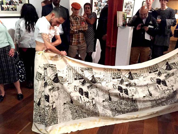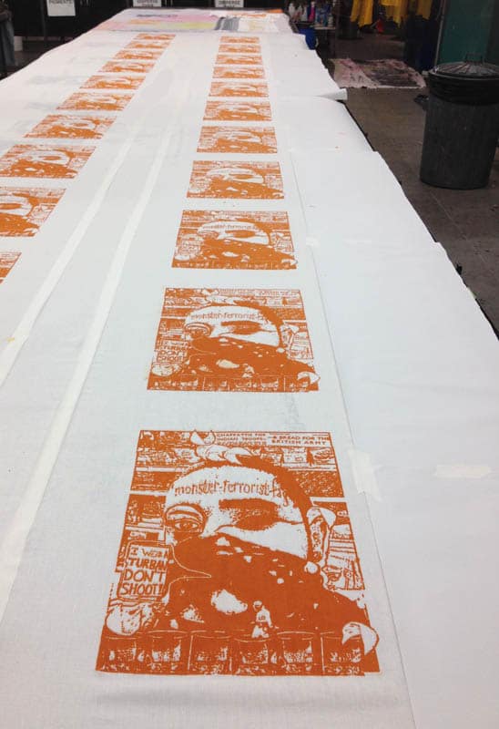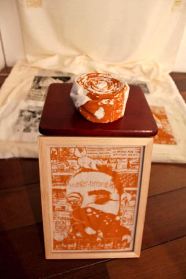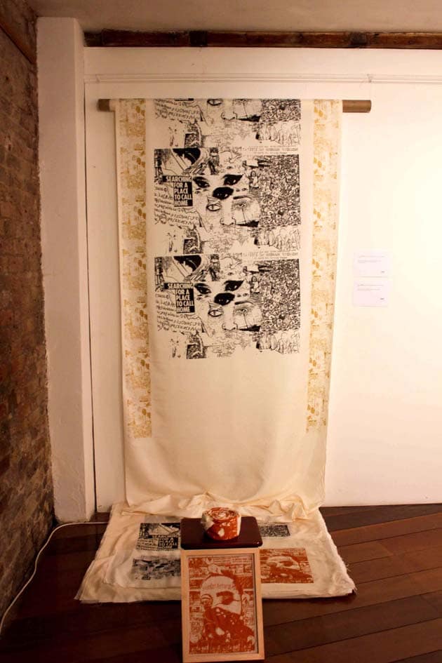 Screening multi-sensory moving image ‘Project/ed’ about contemporary queer South Asian identity in the diaspora relating to the politics of cloth and migrant labour and displaying printed collages on cloth entitled: There is More at Stake Than Just 5 Metres of Cloth.