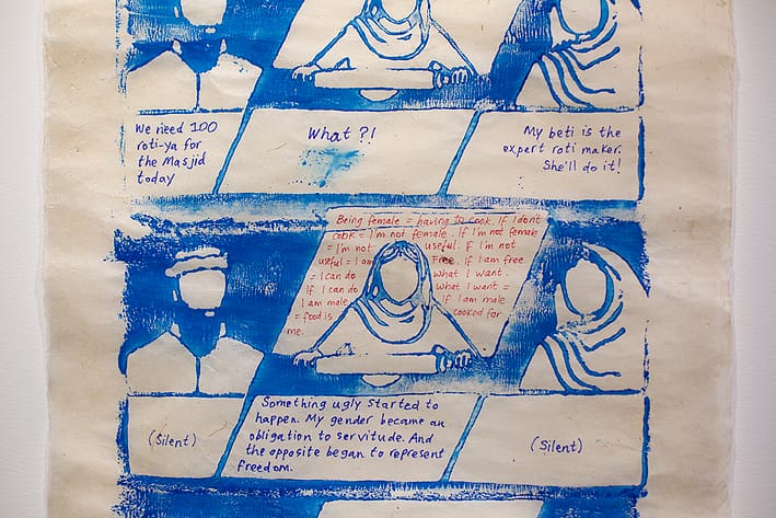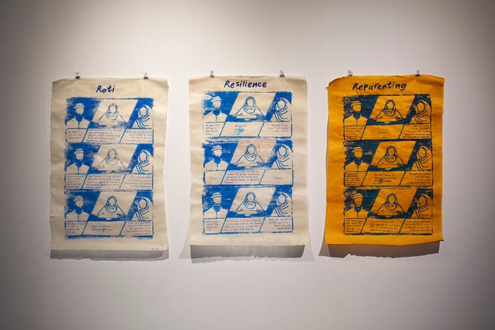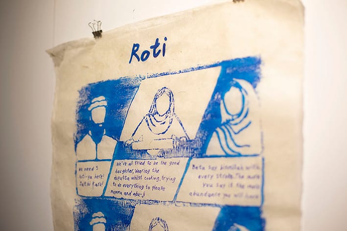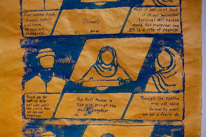 The limited surface area of the rolling pin means the printed outcome is a continuous repeat pattern. Using the same motif, but changing the dialogue and internal thoughts of the characters, I ask, can we change our relationship to a situation based on how we think about it? The final strip of the three, in yellow, suggests a re-working of the archetypal South Asian family dynamic. Can we heal and move forward whilst holding on to cultural heritage that provides identity and binds us together? Can I begin to cook roti again, shedding the old limited notions I’d learnt, and find new meaning for roti in my life? And most importantly, can we do this together?