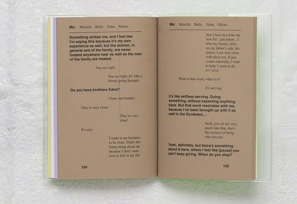 JASLEEN: In a way, it gave me a new lens to look at Teflon. It made me look at it’s restrictive qualities of womanhood and of centering womanhood, but also the process of this book really coming from a place of like *sigh* really having to sit with familial traumas that are rooted in patriarchy — rooted in abuses that are enacted from men onto women. I really feel that this is a process…like if I was to turn to the subject now – three years on – it would be something else. It’s really nerve racking to read it again and to see the rawness and unedited nature of my voice in it and the unedited nature of having these conversations, but I also wanted to trust or honour that because it’s not an academic text or heritage project. It’s not representative of all ”South Asian-ness”. This was commissioned for a white institution – Glasgow Women’s Library – amazing as they are, I really wanted to hold back in what I/we put out into the world and care for those intimacies shared in the book. So to decide, for example, that four short conversations was enough!