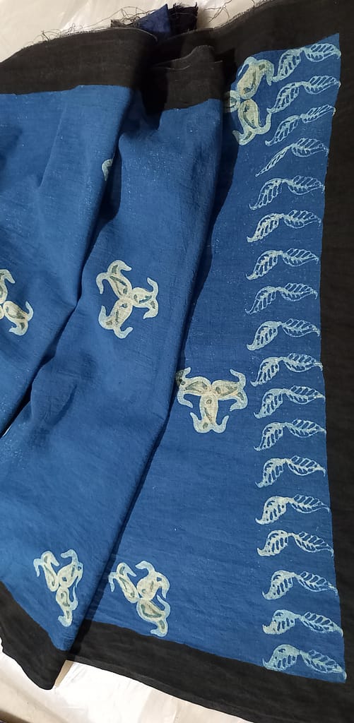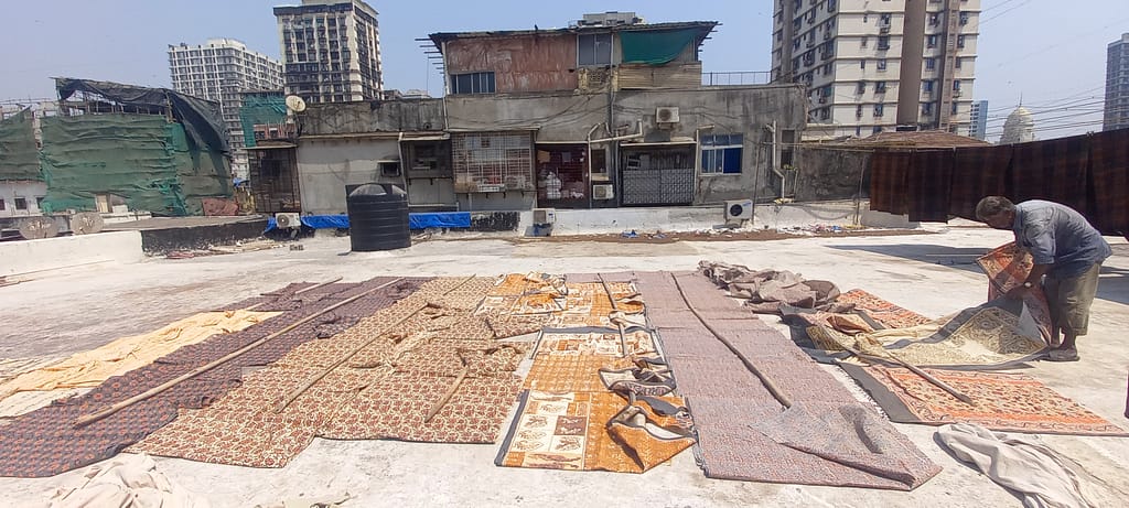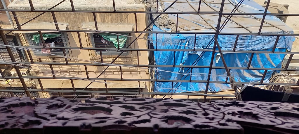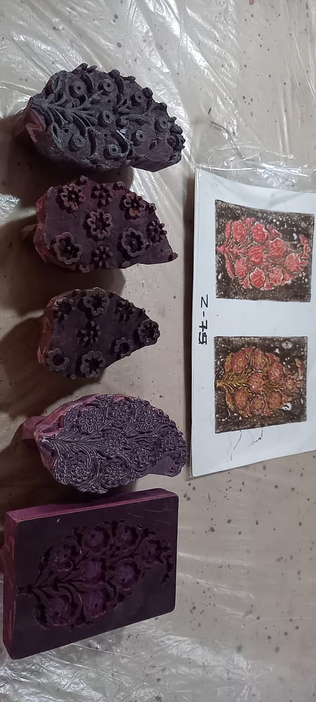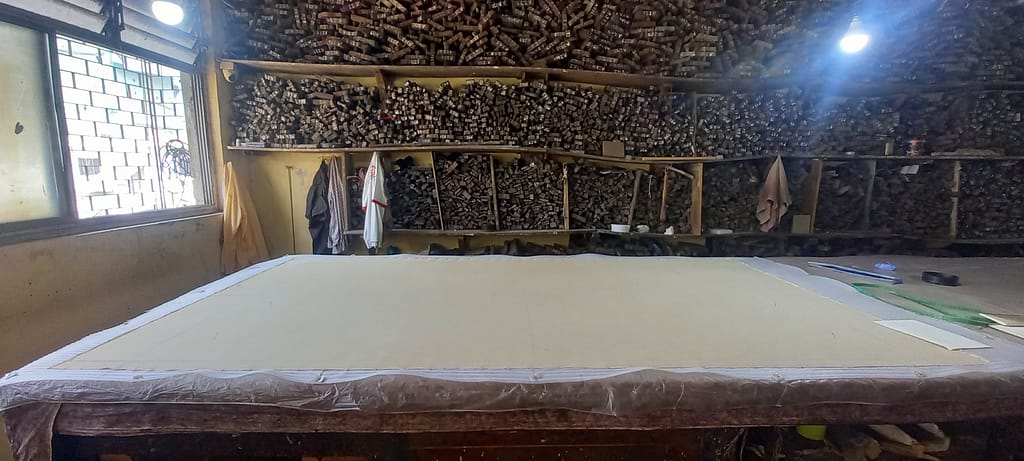 My Ajrak print workshop with Safraz at Pracheen began on a hot humid April day in Mohammed Ali Road in Mumbai. Its started with a blank canvas of organic cotton which had been prepared with ‘harda’ a fruit of the Chebulic Myrobalan tree used for its ayurvedic medicinal benefits but also to prepare cloth in mordanting before it will be dyed as it fixes the dye colour by binding to it better when overdyeing, the tannins give a warm yellow colour which can be lightened or deepened as a preference. The blank canvas stood out amongst the 10 lakh wood block behind it, suggesting an almost infinite possibility awaiting. New blocks are created all the time and yet some ancient 80-100 years old blocks are continued to be used and are either repaired or recreated new..