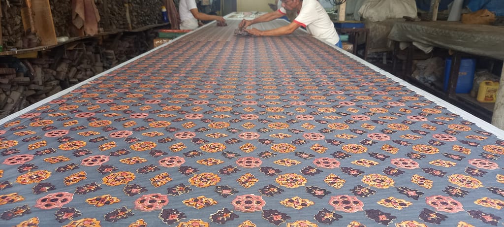 Dyeing and washing is also a skill. A copper pot is used to ensure stability of the dye-ing. To ensure even dyeing, the cloth must be introduced to the dye carefully, mixed around lightly and removed and gathered. Its easy for the cloth to stick to itself when wet so this step in super important. The process uses a lot of water, to make sure the dye is rinsed sufficiently, water being essential to this trade and its production, which is why it makes sense that the first printing happened in villages located near free flowing rivers in Sindh and Kutch. Access to clean water is essential.
