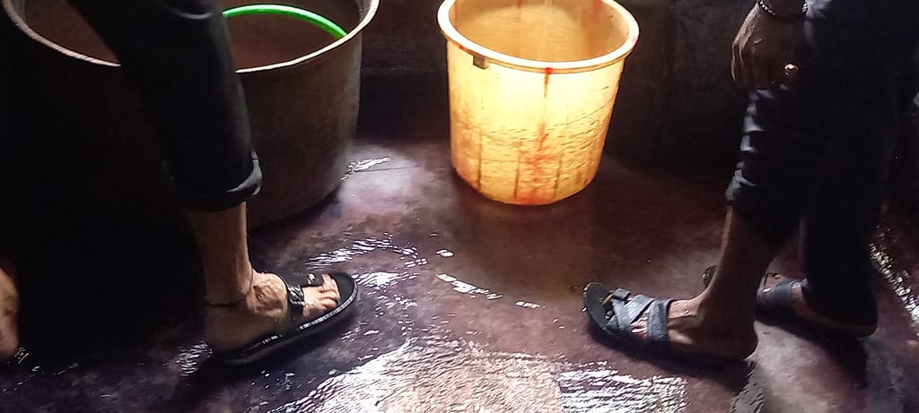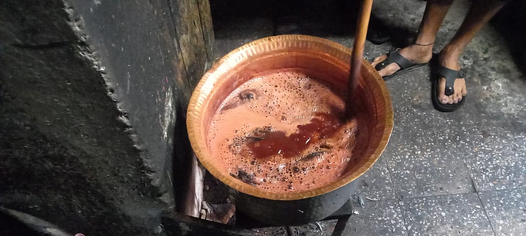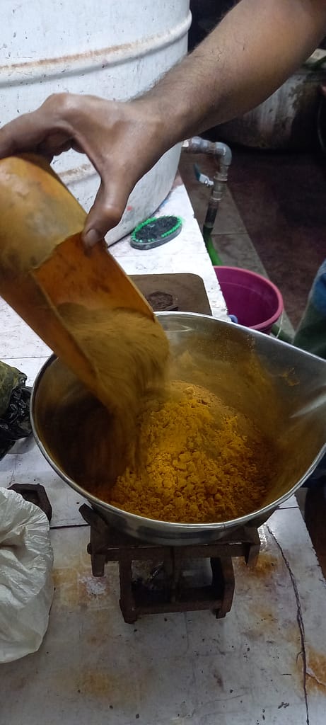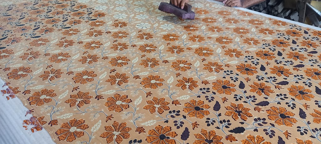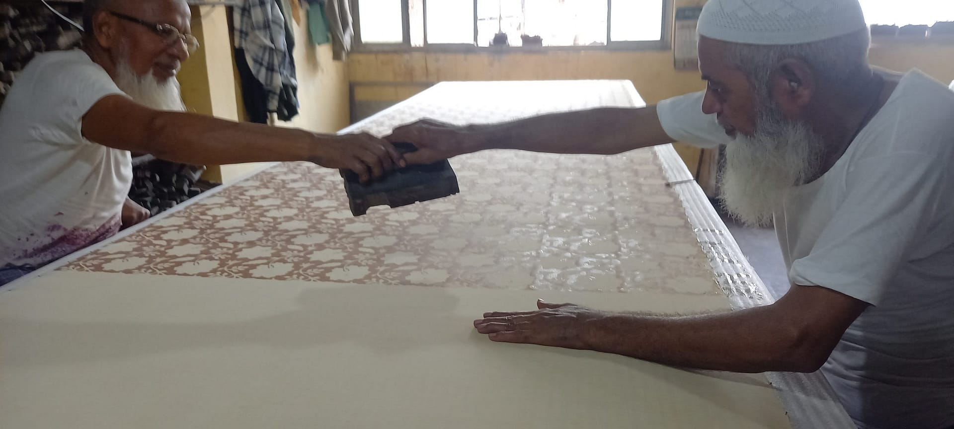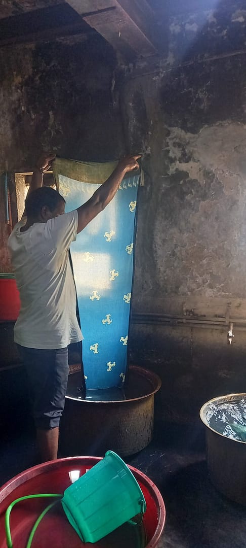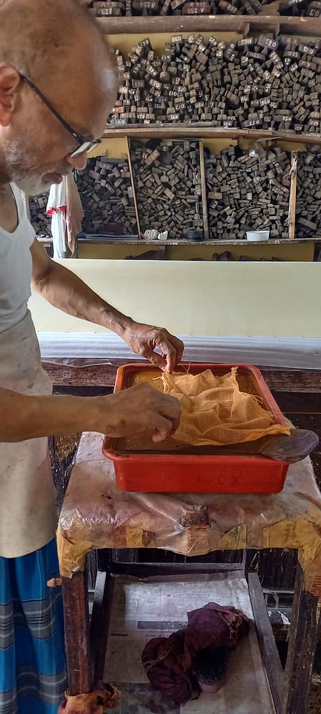 Sarfaz told me that they make the pigment for what they will use daily, first thing in the morning. They also have buckets of fermented dyes they use and feed. There are different processes involved which are important to the job such as mixing the pigment well and using muslin cloth in layers with the pigment to keep it easy and clean to use when printing. Also, weighing out the powders for dyeing in the correct ratios with the mordants. Heating them up to the correct temperature or fermenting the dyes for the right amount of time making sure to check in on them.