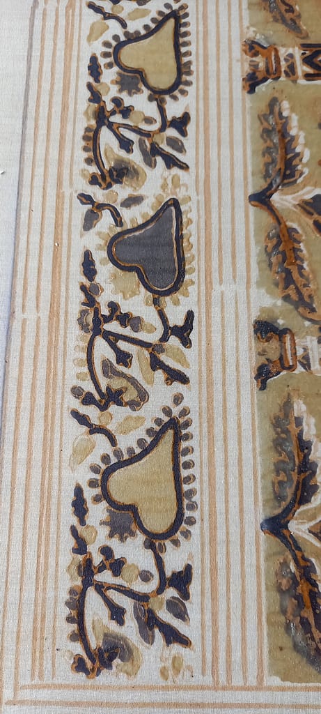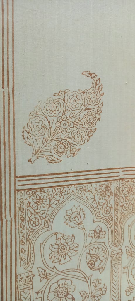Since I am researching the migration of the aam/bi mango motif in all its manifestations (known as ‘Paisley’ in UK). I asked Safraz to share his ‘aam’ blocks with me. He had many but in the end I selected a 3 or 4 different blocks, However, each pattern contained 4 blocks each as a set: for the backgrounds, the lines and the fillings. You don’t have to use all blocks in every design, depending on what you are creating in your design, so I chose one buti design for the corners with the line and filling, minus the background, and a complete set for the borders and another complete set for a repeat pattern. This gave complete detail and layers. The process began with the resist, using lime and arabic gum, sometimes clay or mud is used. The resist is the part of the cloth that once dyed will remain in the original colour of the cloth. The next line layer was a black layer made with iron (rusted metal) and another with alizarin for the filling details. Getting the blocks to line up is very tricky. There is always a margin of error, which fortunately ends up making print look hand-made and beautiful, as you can spot the use of the hand verses a machine, the slight mishaps give the final design its unique look, ironically machines are now imitating this look by programming in visual errors!