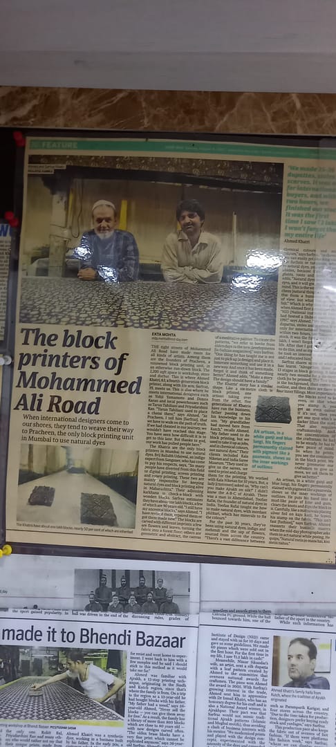 My Ajrak print workshop with Safraz at Pracheen began on a hot humid April day in Mohammed Ali Road in Mumbai. Its started with a blank canvas of organic cotton which had been prepared with ‘harda’ a fruit of the Chebulic Myrobalan tree used for its ayurvedic medicinal benefits but also to prepare cloth in mordanting before it will be dyed as it fixes the dye colour by binding to it better when overdyeing, the tannins give a warm yellow colour which can be lightened or deepened as a preference. The blank canvas stood out amongst the 10 lakh wood block behind it, suggesting an almost infinite possibility awaiting. New blocks are created all the time and yet some ancient 80-100 years old blocks are continued to be used and are either repaired or recreated new..