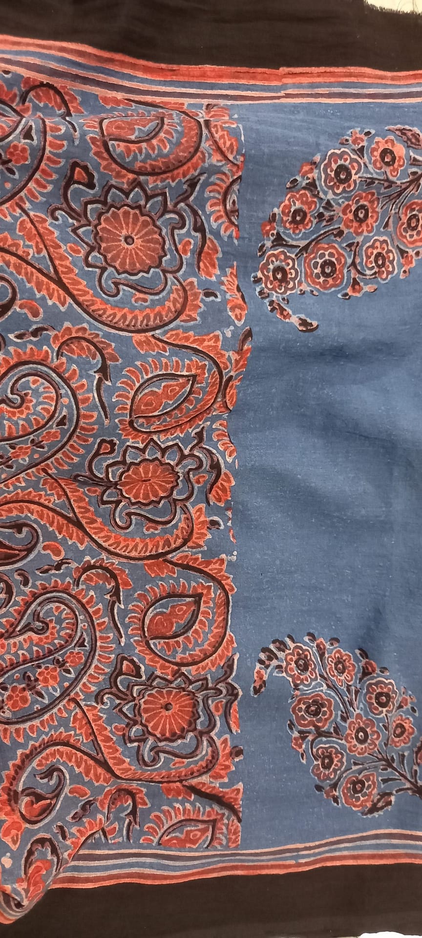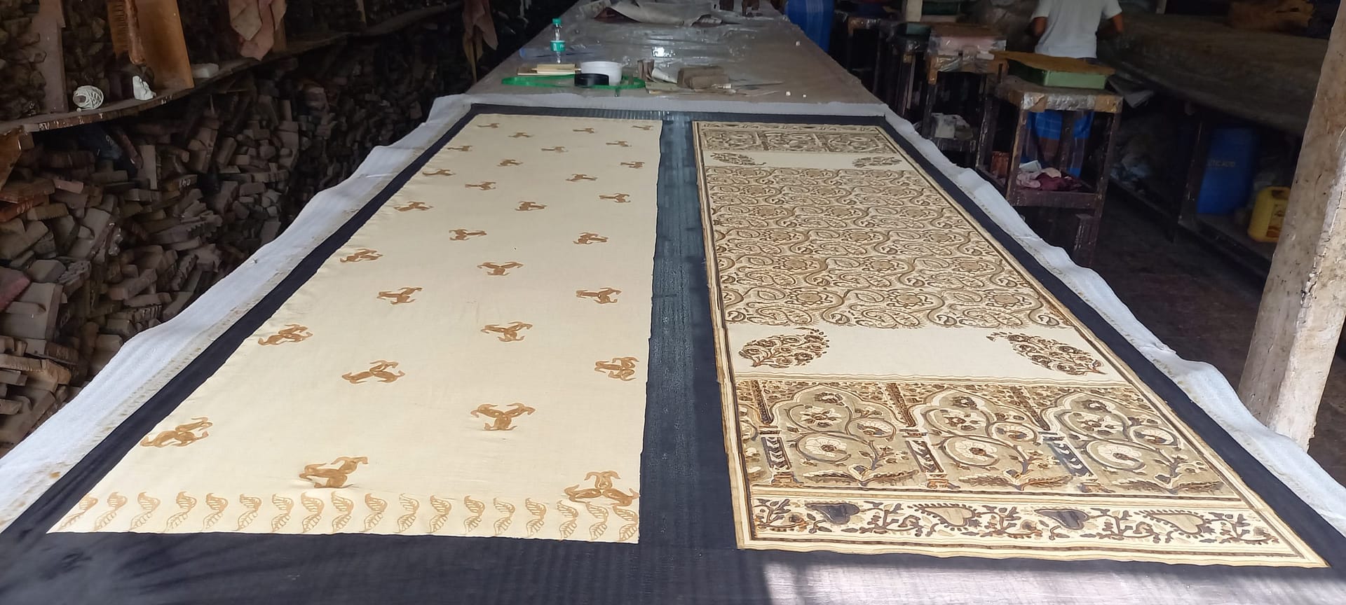 Since I am researching the migration of the aam/bi mango motif in all its manifestations (known as ‘Paisley’ in UK). I asked Safraz to share his ‘aam’ blocks with me. He had many but in the end I selected a 3 or 4 different blocks, However, each pattern contained 4 blocks each as a set: for the backgrounds, the lines and the fillings. You don’t have to use all blocks in every design, depending on what you are creating in your design, so I chose one buti design for the corners with the line and filling, minus the background, and a complete set for the borders and another complete set for a repeat pattern. This gave complete detail and layers. The process began with the resist, using lime and arabic gum, sometimes clay or mud is used. The resist is the part of the cloth that once dyed will remain in the original colour of the cloth. The next line layer was a black layer made with iron (rusted metal) and another with alizarin for the filling details. Getting the blocks to line up is very tricky. There is always a margin of error, which fortunately ends up making print look hand-made and beautiful, as you can spot the use of the hand verses a machine, the slight mishaps give the final design its unique look, ironically machines are now imitating this look by programming in visual errors!