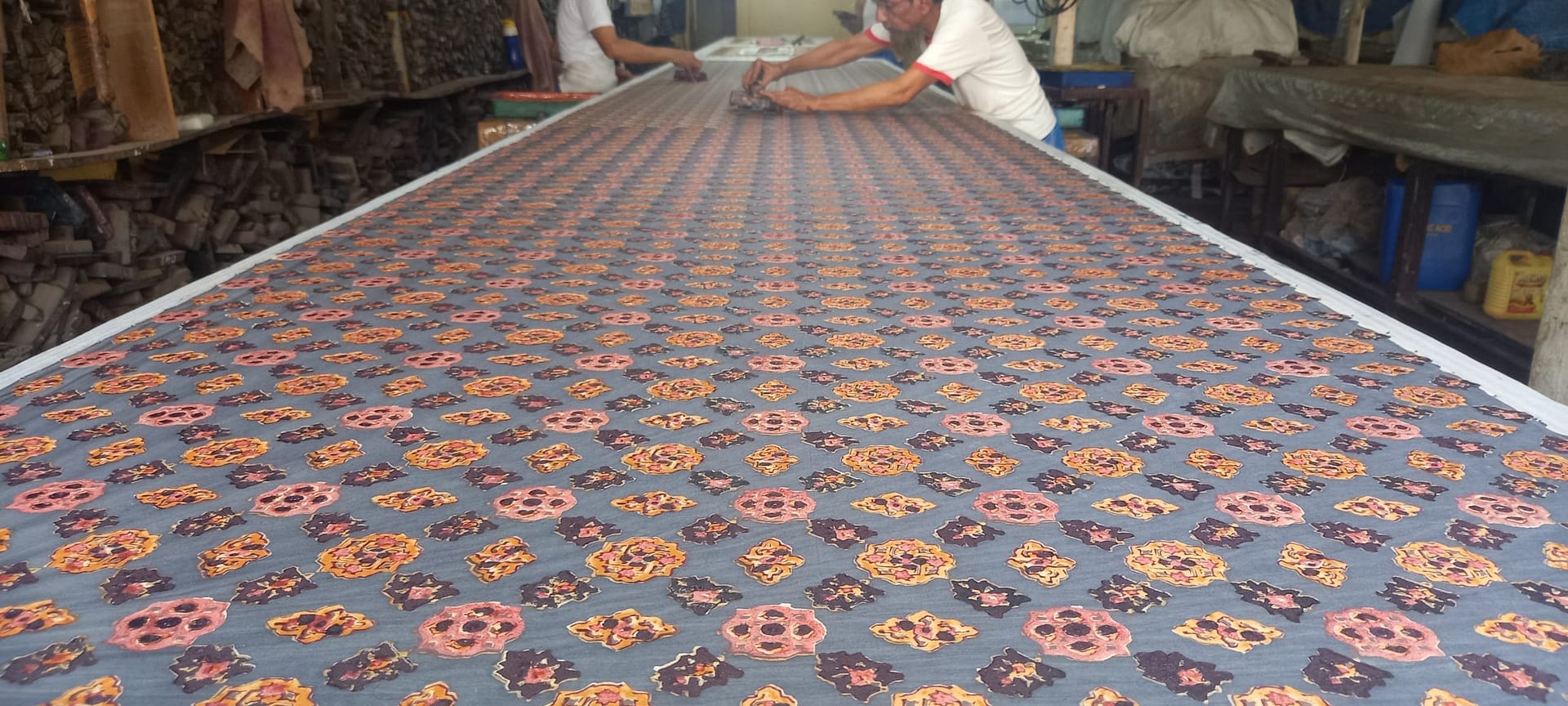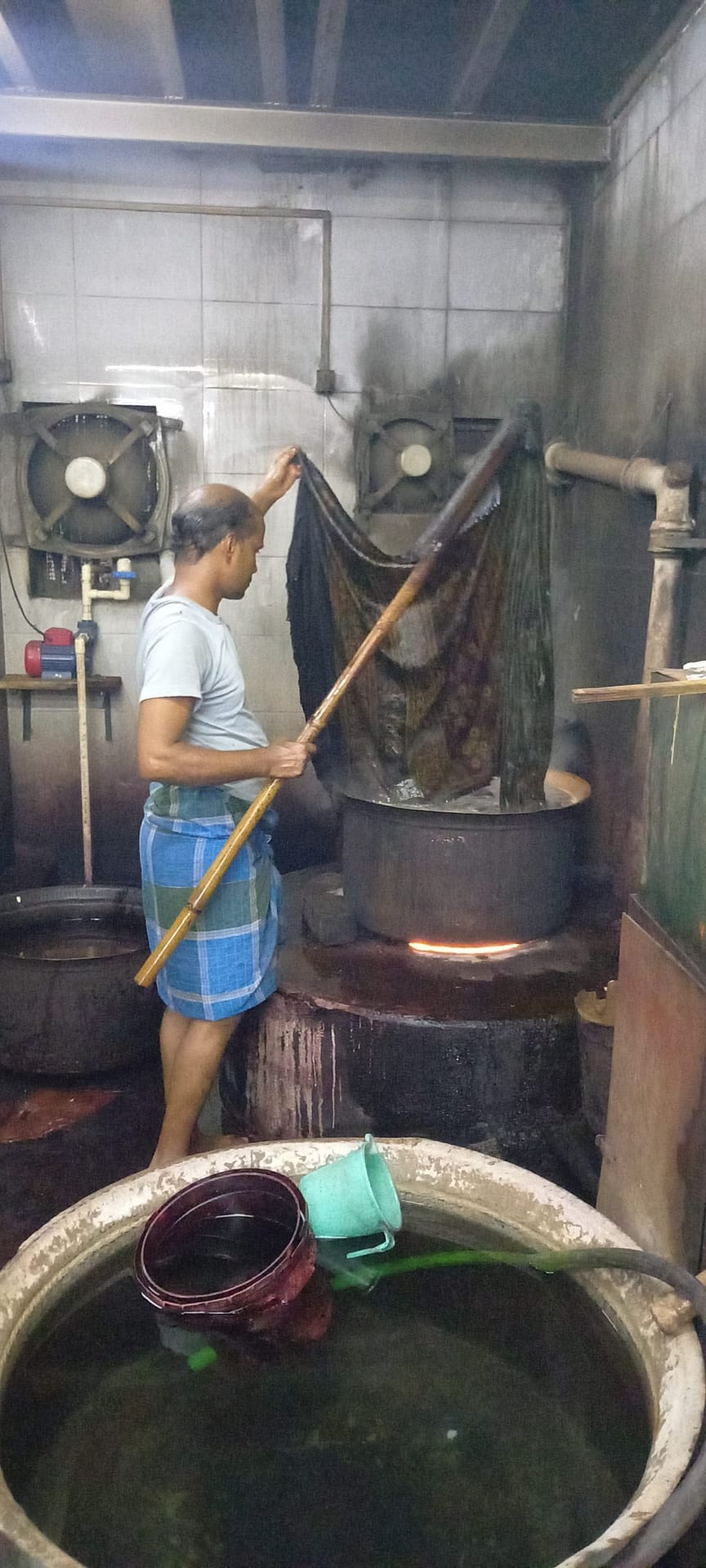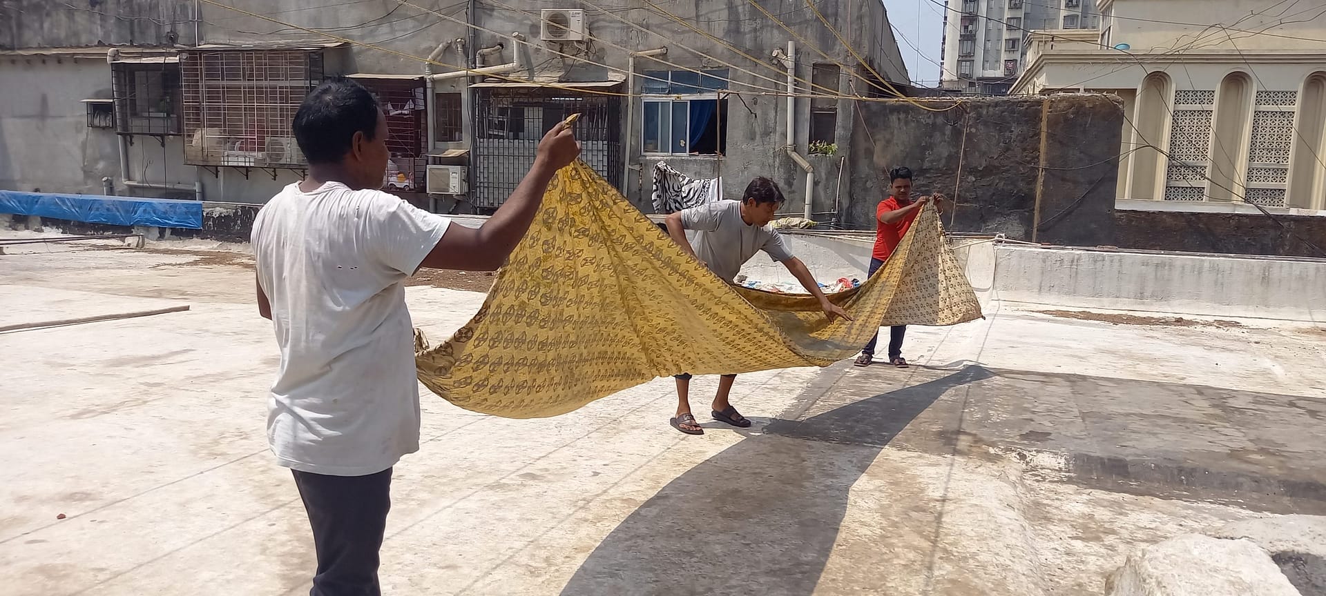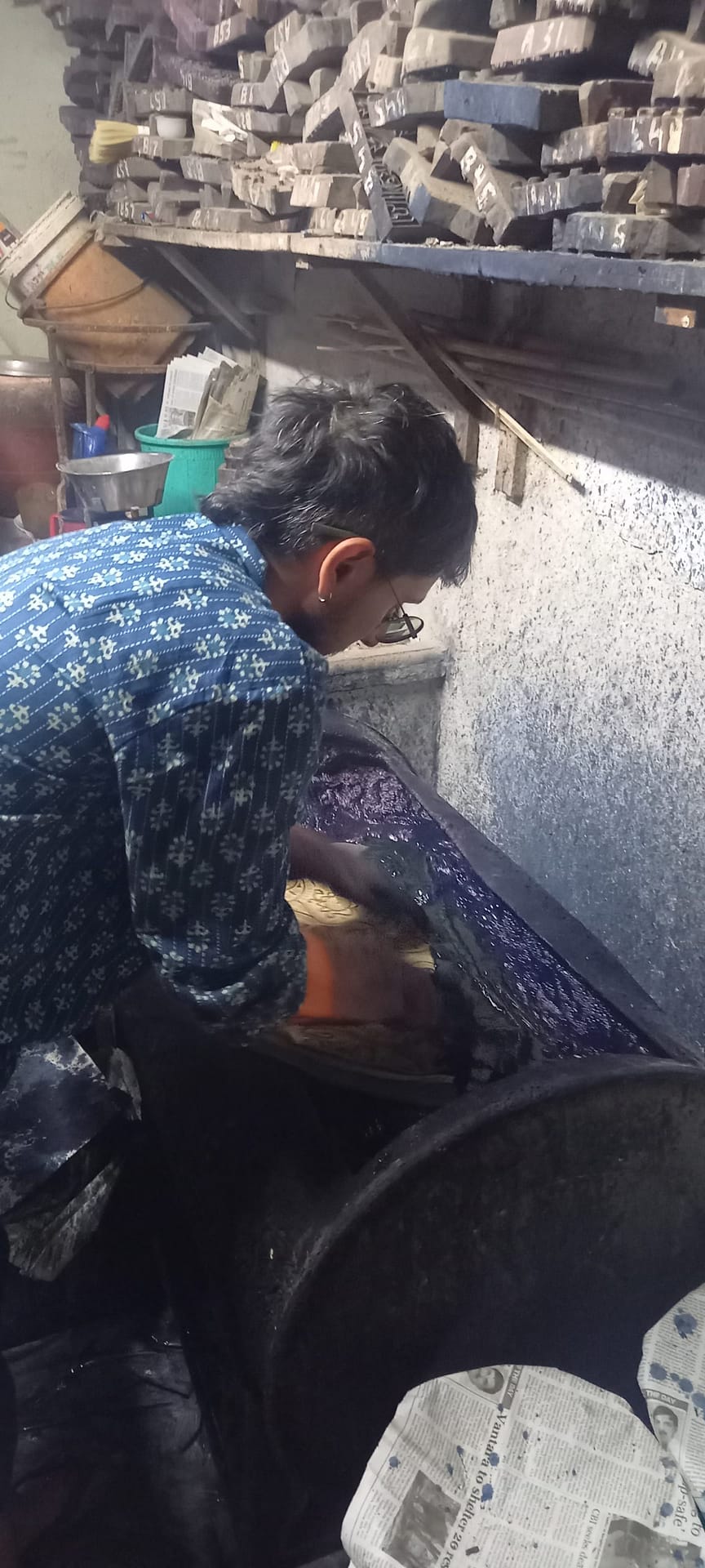 Sarfaz told me that they make the pigment for what they will use daily, first thing in the morning. They also have buckets of fermented dyes they use and feed. There are different processes involved which are important to the job such as mixing the pigment well and using muslin cloth in layers with the pigment to keep it easy and clean to use when printing. Also, weighing out the powders for dyeing in the correct ratios with the mordants. Heating them up to the correct temperature or fermenting the dyes for the right amount of time making sure to check in on them.