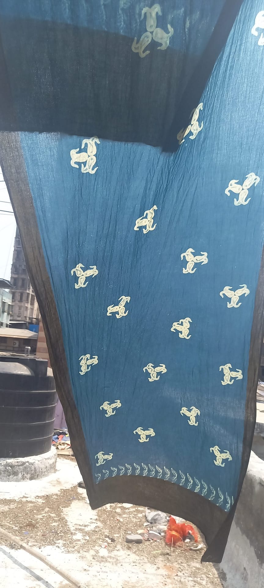 Dyeing and washing is also a skill. A copper pot is used to ensure stability of the dye-ing. To ensure even dyeing, the cloth must be introduced to the dye carefully, mixed around lightly and removed and gathered. Its easy for the cloth to stick to itself when wet so this step in super important. The process uses a lot of water, to make sure the dye is rinsed sufficiently, water being essential to this trade and its production, which is why it makes sense that the first printing happened in villages located near free flowing rivers in Sindh and Kutch. Access to clean water is essential.