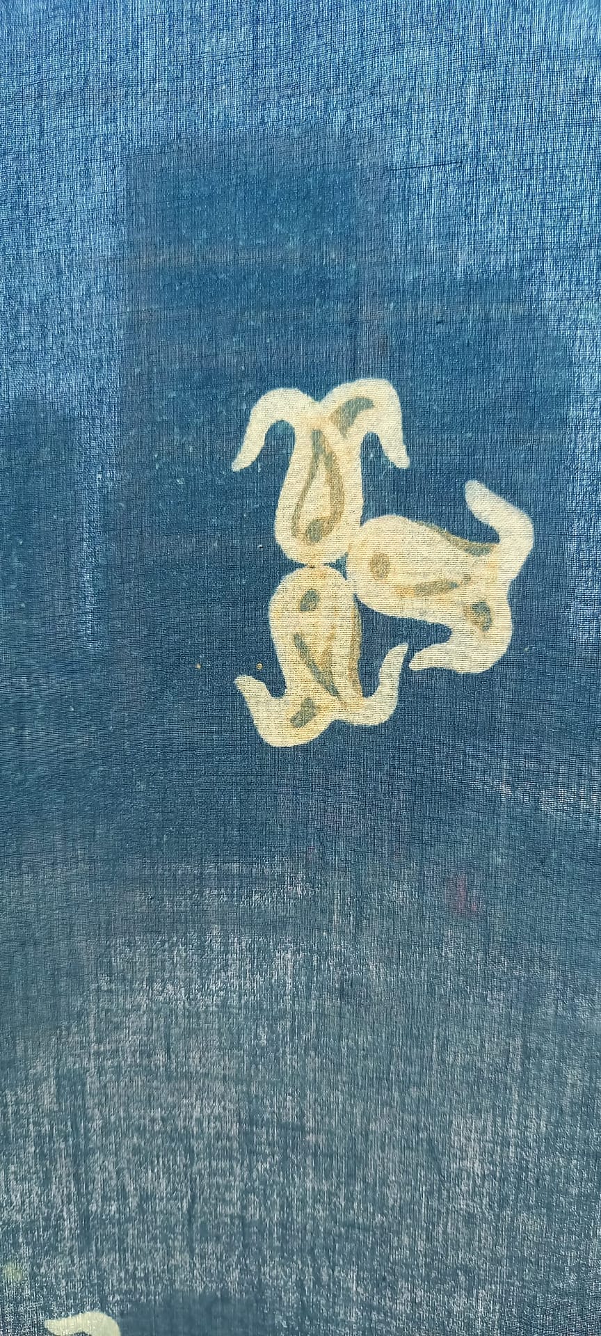 I decided to split the cloth into two to get two designs for variation and decided for one to be more traditional and the another design to be more contemporary, organic and simplistic. I used a simple block set of two for a small aam buti motif and a leaf pattern for the border. These I scattered roughly across the cloth. These were experimental designs rather than prepared ones as I wanted to use already made blocks and designs to get an idea of the different types available. I was playful with layout and they were loosely inspired by my extensive research of textiles in various museums: Calico Ahmedabad, Living and Learning Design Centre, Kutch, Anokhi museum Jaipur and Titanwala museum in Bagru.
